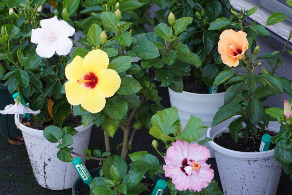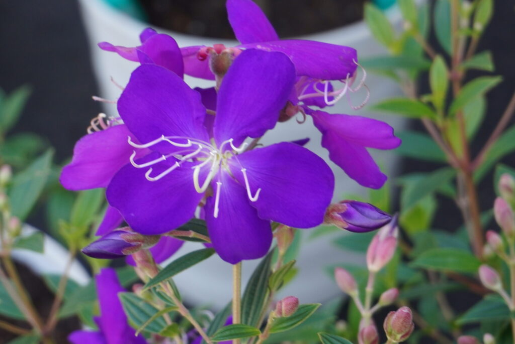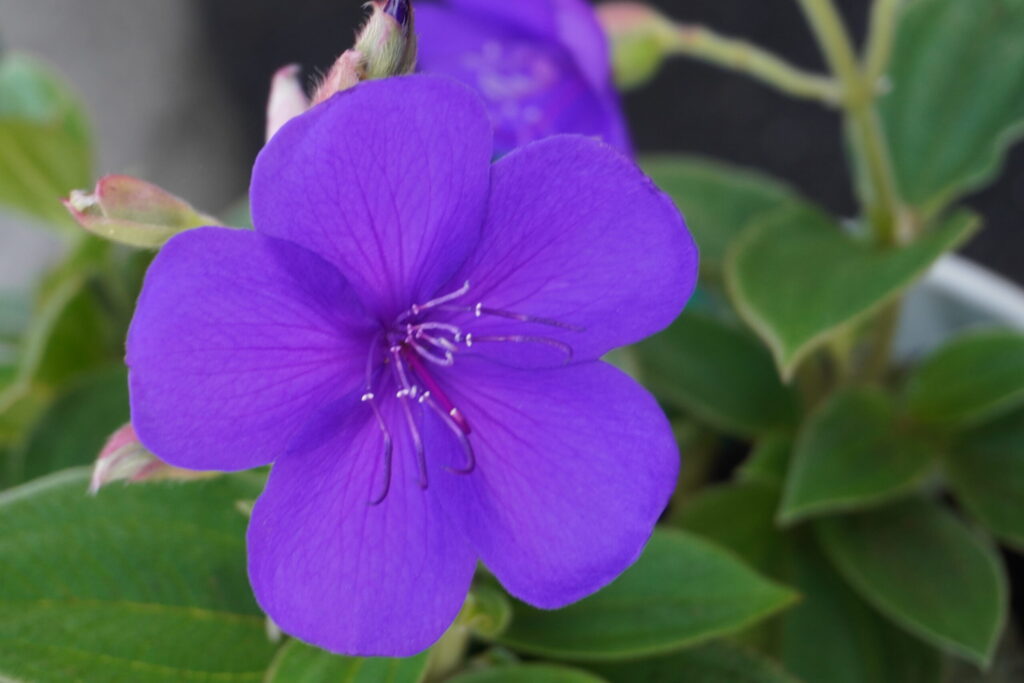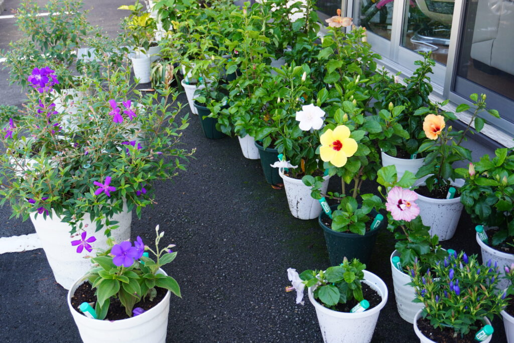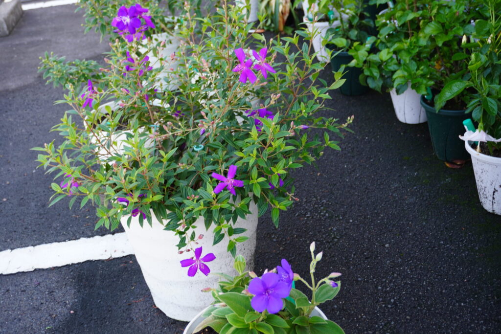 「デイサービスこもれび」の玄関先に鉢植えの「ノボタン」が置かれています。目的は、利用者様の「ストレス」を軽減するためです。暑さのため一休みしていた「ハイビスカス」も、活動を再開しています。(愛媛県西条市小松町大頭、デイサービスこもれび)