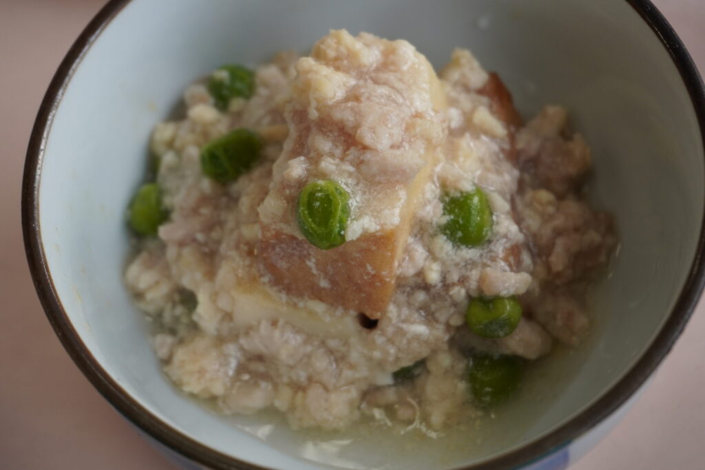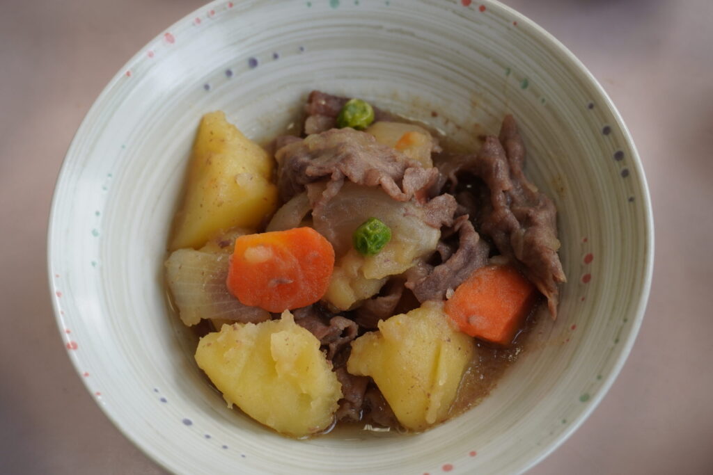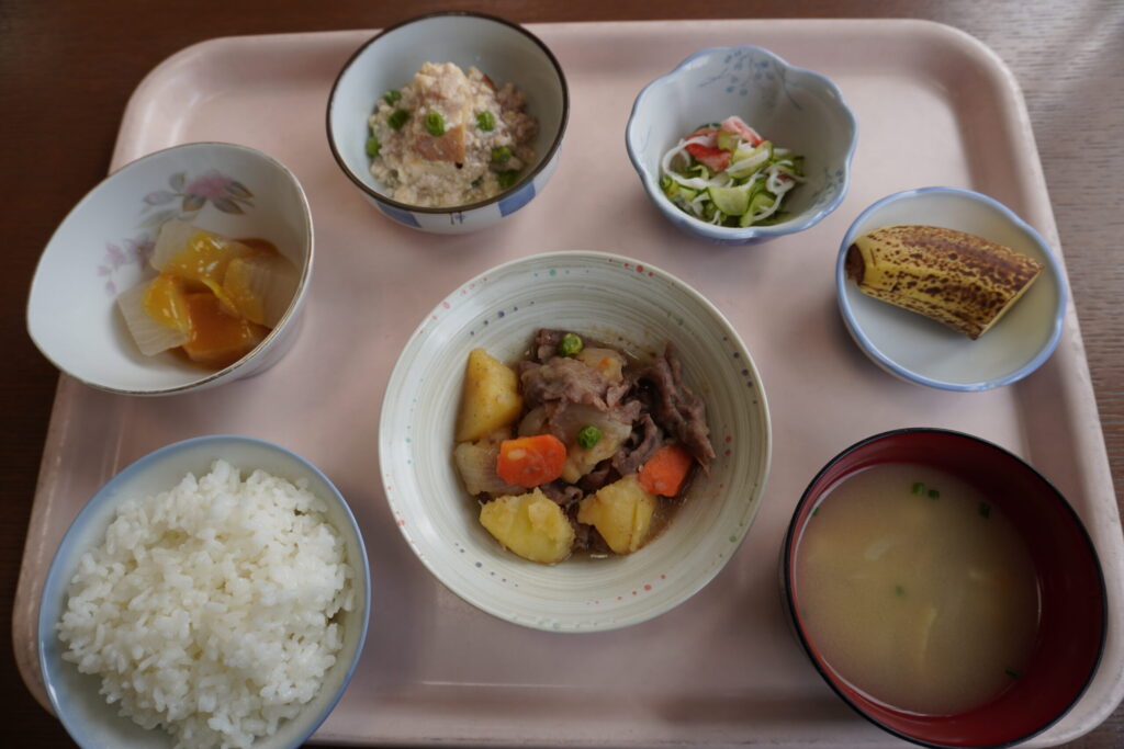 「デイサービスこもれび」の本日の昼食です。メインメニューは、「肉じゃが」です。「日本の味」「故郷の味」「お母さんの味」です。「肉じゃが」は、食するだけで「回想法」としての役割を果たしています。「見て」「匂って」「触って」食します。周囲の「おいしいね」という声で「聴覚」まで使います。「佐賀牛」の旨味が、「ジャガイモ」の味を引き立てます。(愛媛県西条市小松町大頭、デイサービスこもれび)