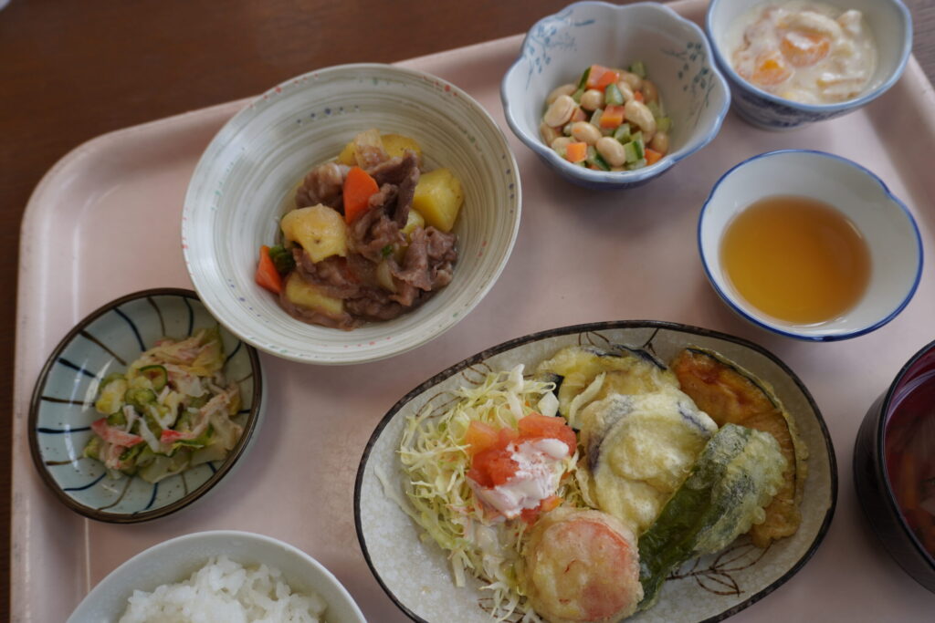 「デイサービスこもれび」の本日の昼食です。メインメニューは「肉じゃが」です。牛肉とジャガイモの味がマッチして、落ち着きのある、古き良き時代の日本を想像させてくれる風味を醸し出してくれます。「肉じゃが」昔懐かしい料理です。食材は、できる限り良質なものを使っています。(愛媛県西条市小松町大頭、デイサービスこもれび)