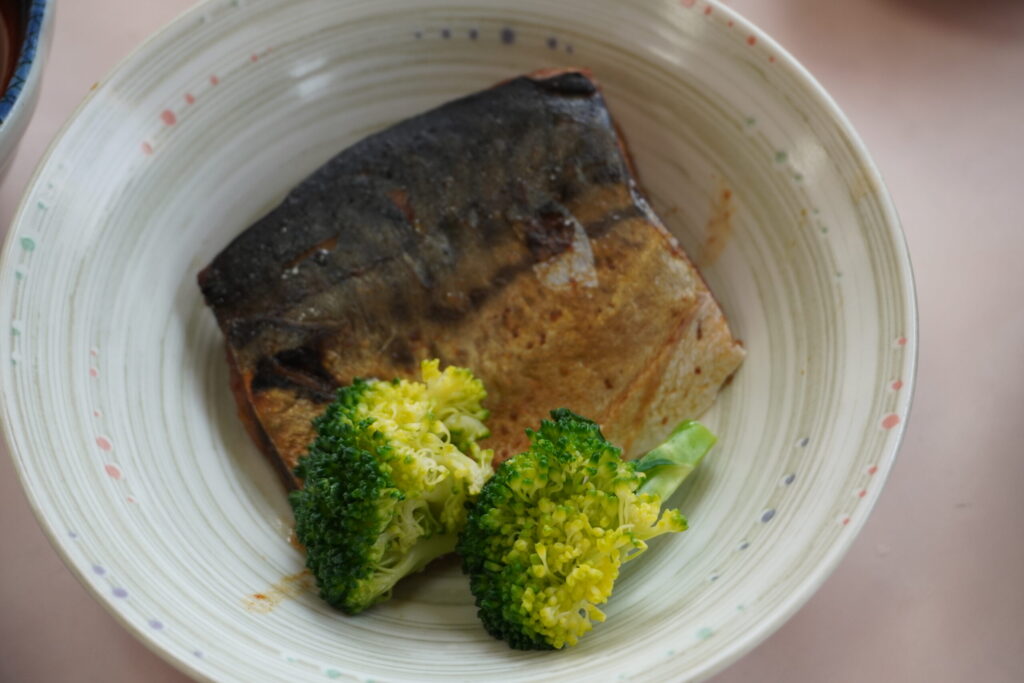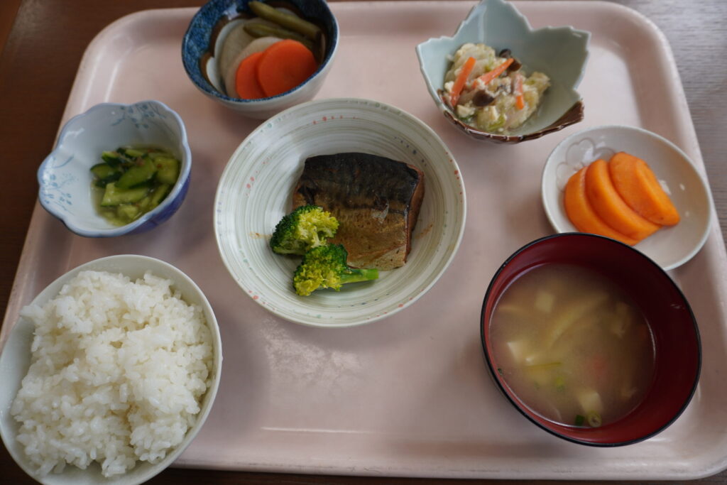 「デイサービスこもれび」の本日の昼食です。メインメニューは、「鯖のみそ煮」です。「日本食研」という会社の「冷凍食品」です。魚は基本的に魚屋さんで購入していますが、味が良ければ「冷凍食品」も使います。理由は、最近の「冷凍食品」の味が進歩して、「生」の食材を越えた味になっているものがあるからです。とにかく「冷凍食品」の進化は驚くべきものがあります。(愛媛県西条市小松町大頭、デイサービスこもれび)